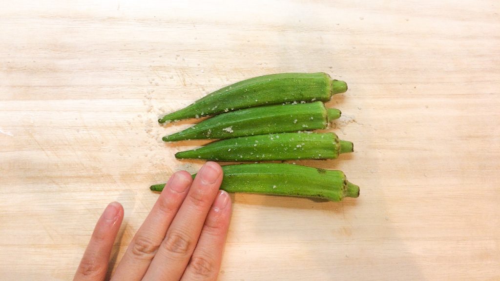 オクラを4・5本ずつをまな板に並べ、塩をふり手で軽く押しながら転がします。