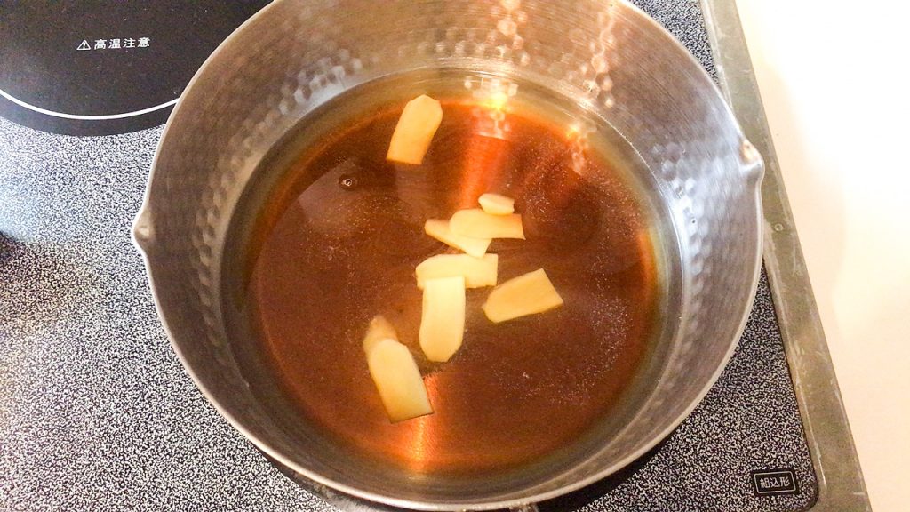 フライパンに調味料としょうがを入れて強めの中火にかけます。