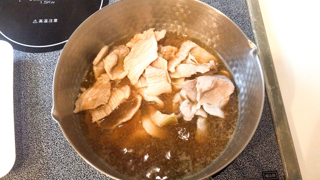 調味料が煮たったら、豚肉を1枚ずつ入れます。