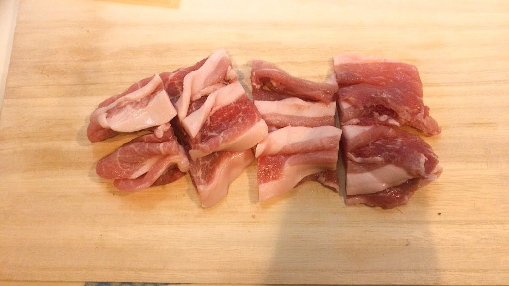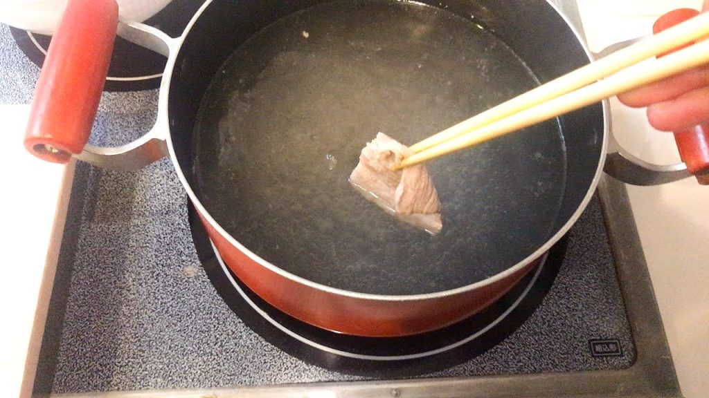 そのままの熱湯で豚肉を湯通ししておきます。豚肉を湯通しをするのはアク抜きをするためです。