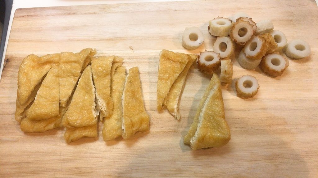 ちくわは小口切り、油揚げは茹でてから横4等分に切って、形が三角になるように斜めに切ります。