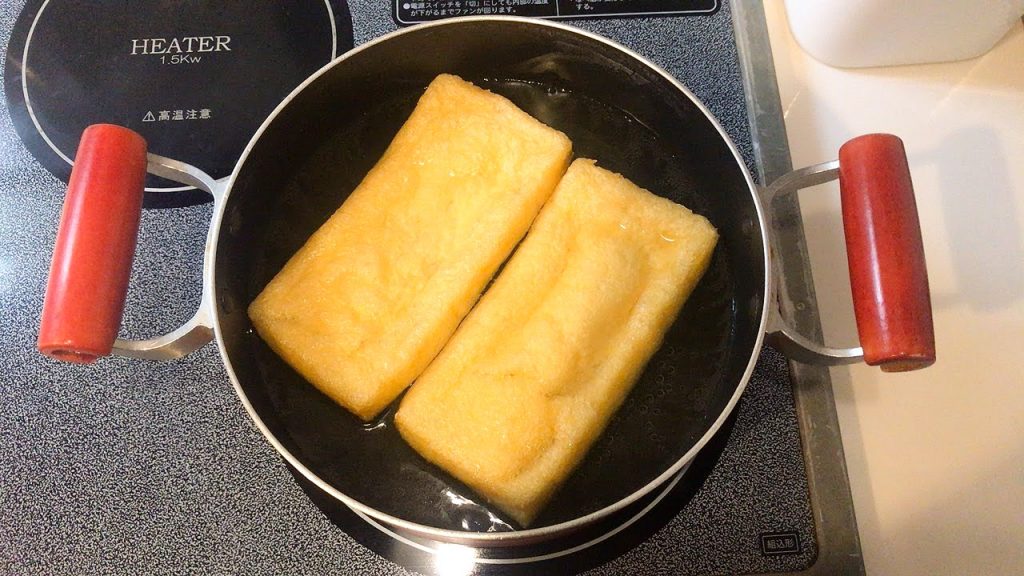 本来のレシピでは油揚げにお湯をかけて油抜きをするのですが、豚肉を茹でるのにお湯を沸かすので、一緒に行いました。