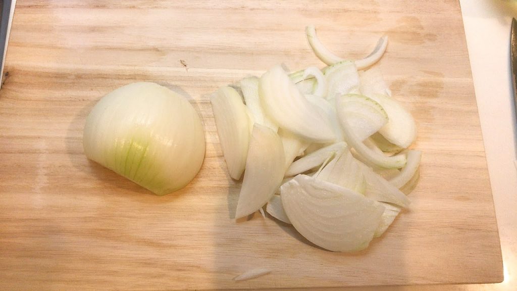 玉ねぎは縦半分に切ってから縦1㎝幅に切ります。