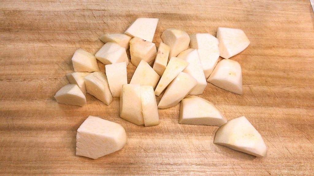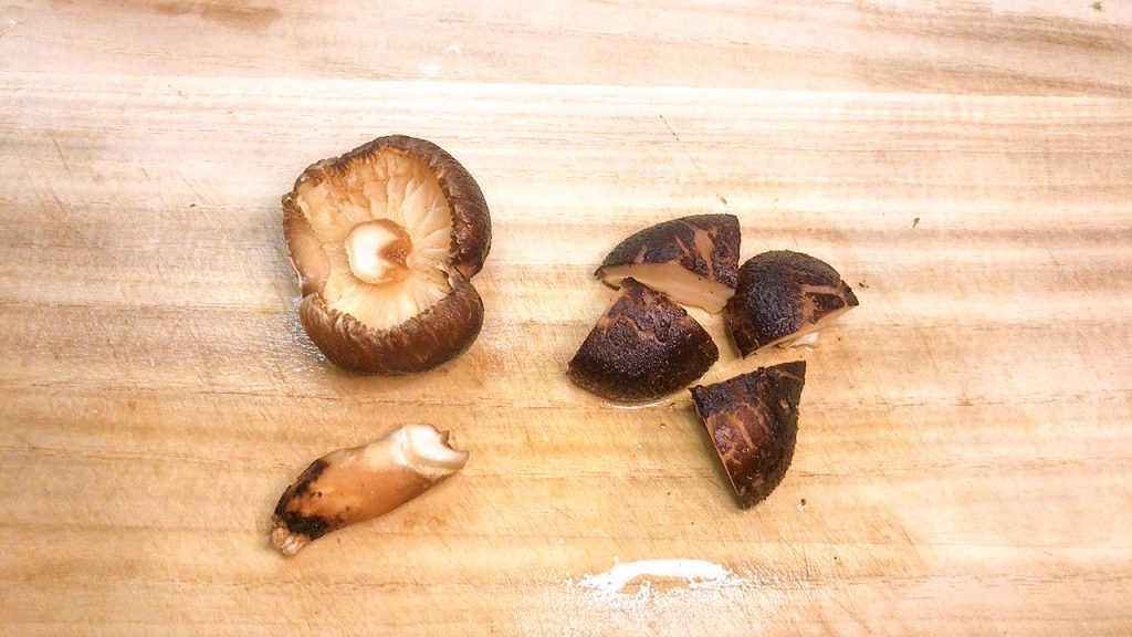 もどした椎茸はしぼって水気を切り、石づきを除き4〜6つ割りにします。