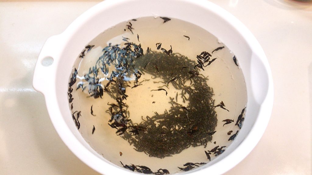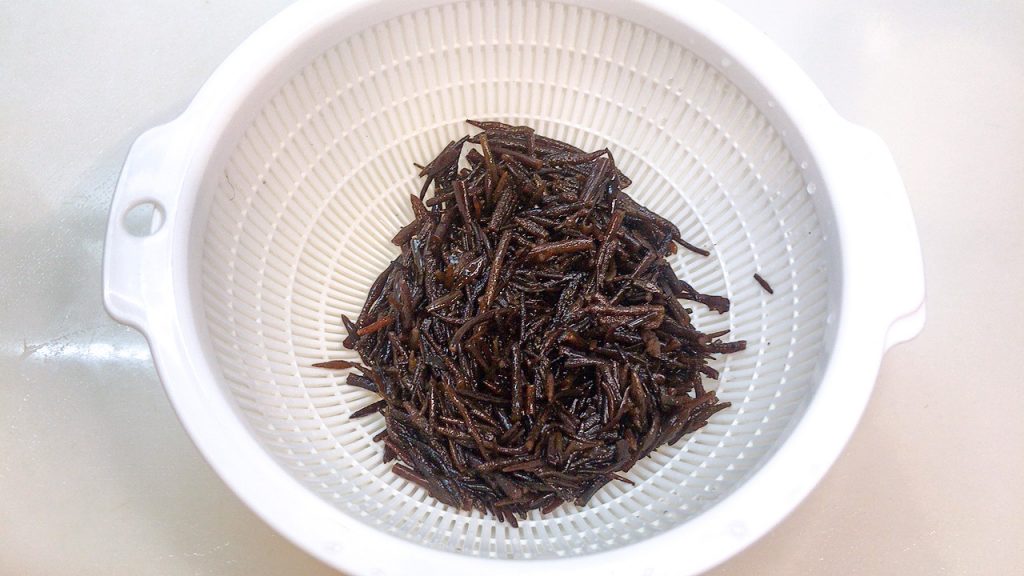 芽ひじきは袋の表示通りにもどし、ザルに上げて水気をきります。