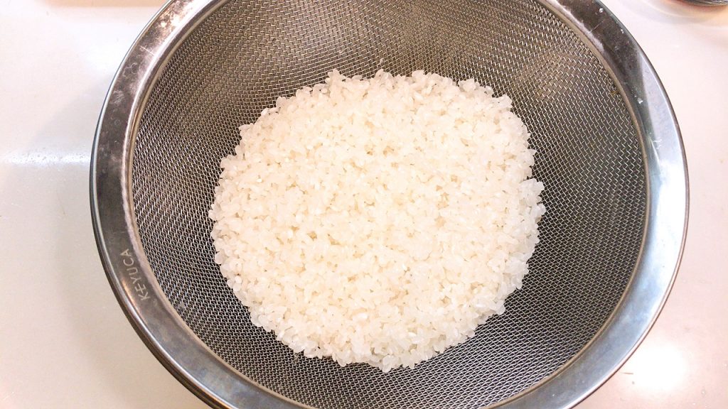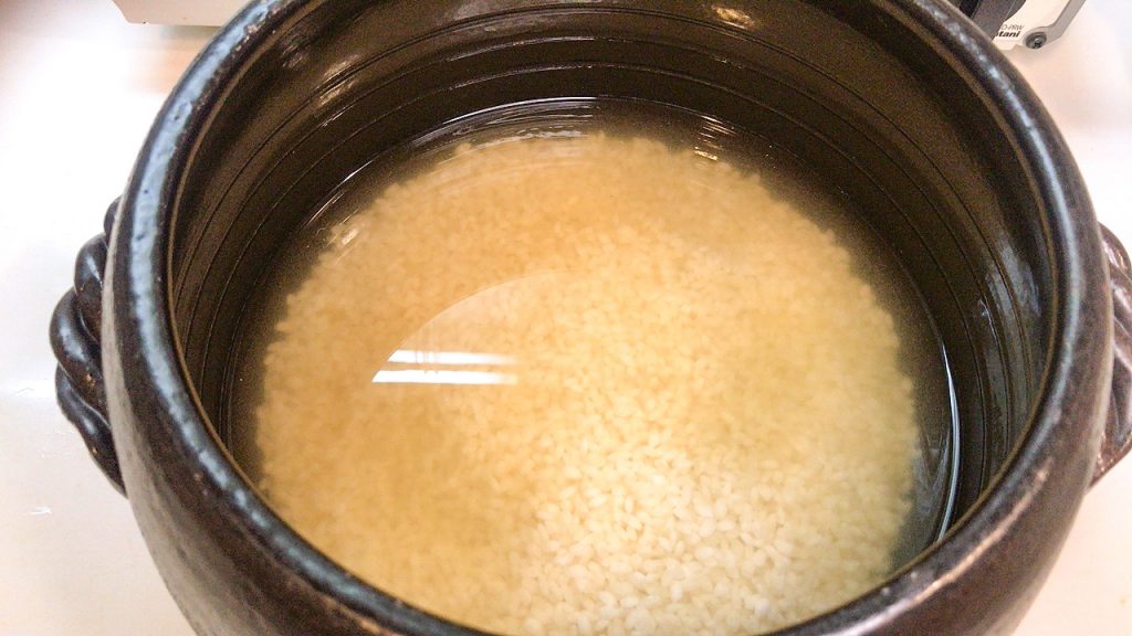 洗っておいた米を土鍋に入れ、干し椎茸のもどし汁に水を足して440~450㎖にして注ぎます。