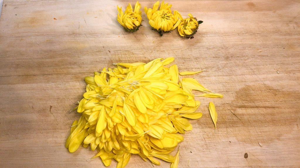 食用菊は真ん中の額の部分は使わないので、花びら部分を摘みます。