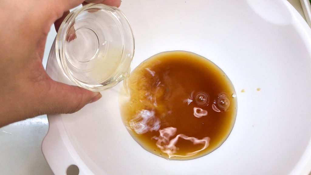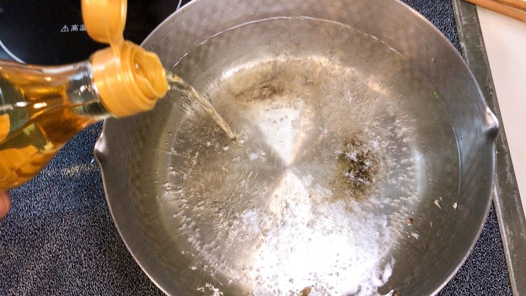 アクが出て黒くなるのを防ぐために酢で色止めをします。