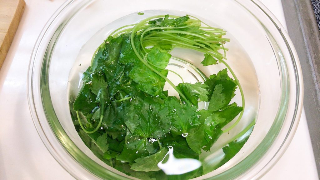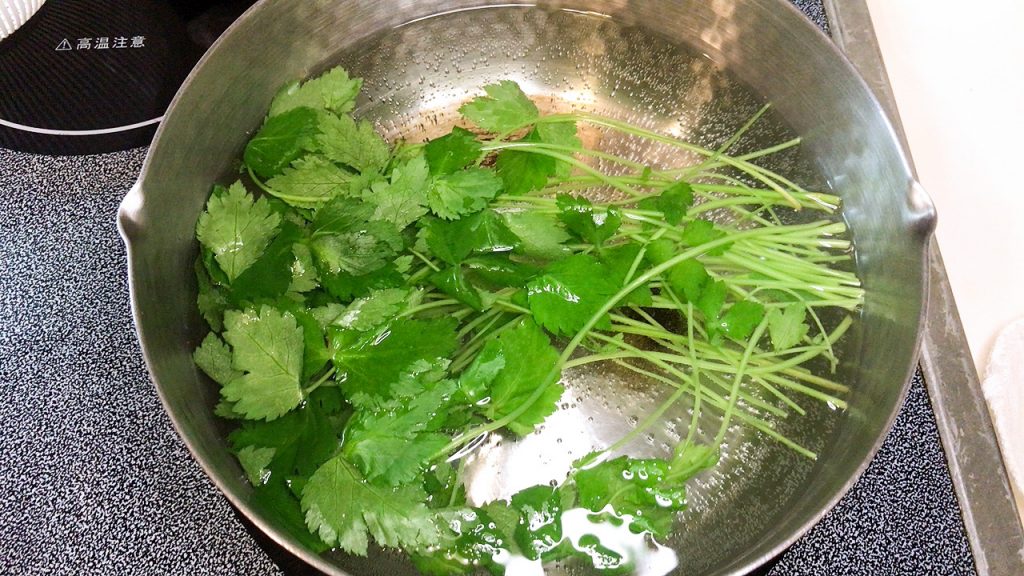 鍋に湯を沸かし、三つ葉をサッと茹でます。時間で言うと20秒もしないくらい。