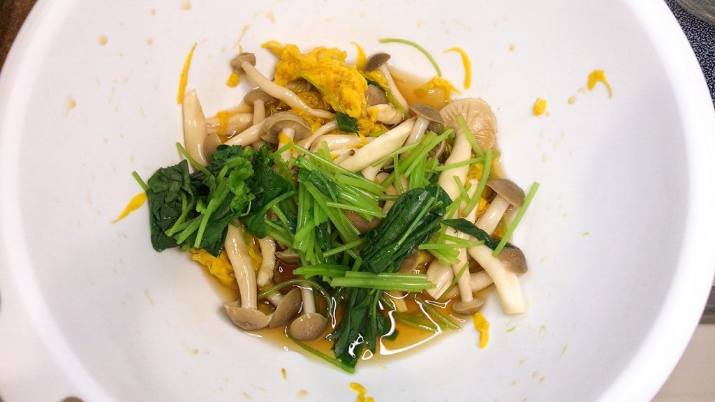 三つ葉を入れてしばらくおくと色が悪くなってしまうので、三つ葉だけは食べる直前に加えましょう。