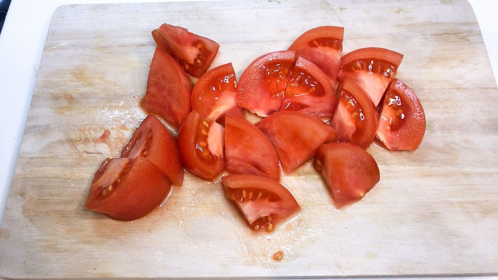 トマトは8つ割りにして横半分に切り、万能ねぎは1cm長さに切ります。
