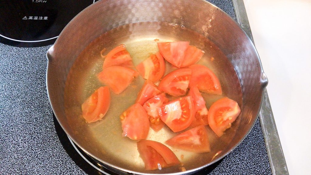 鍋に出汁を入れて火にかけ、煮立ったらトマトを加えてひと煮します。