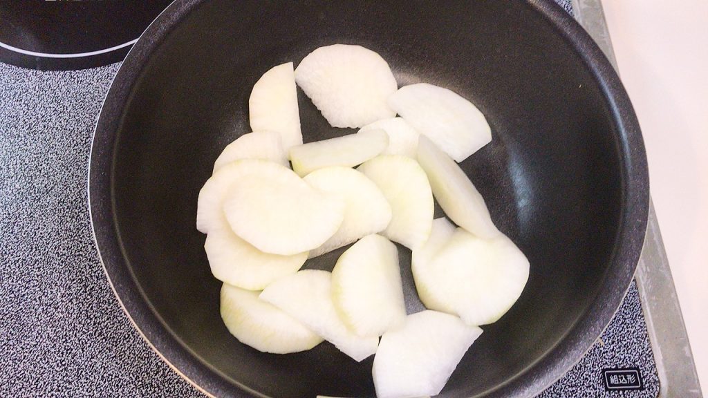 煮汁が少ないように感じますが、大根から水分が出るので大丈夫です。