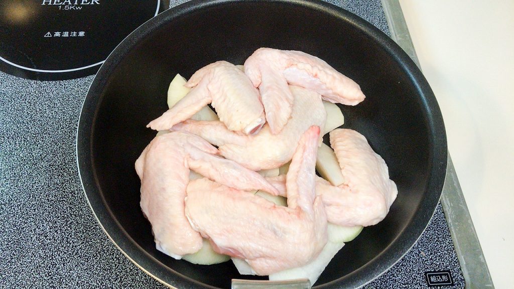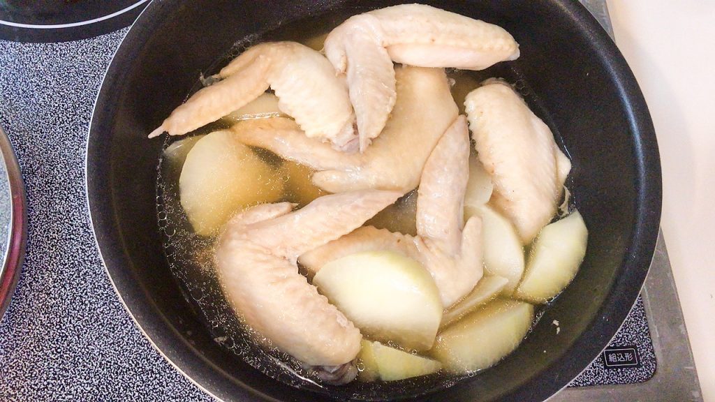 煮えにくいもの・かたいものを下にいれると火が早く通りやすくなりますし、鶏の旨味も大根に染み込みます。