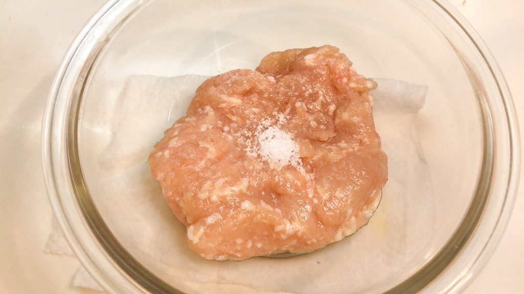 ボウルにひき肉と塩を入れ、粘りが出るまでよく練り混ぜます。