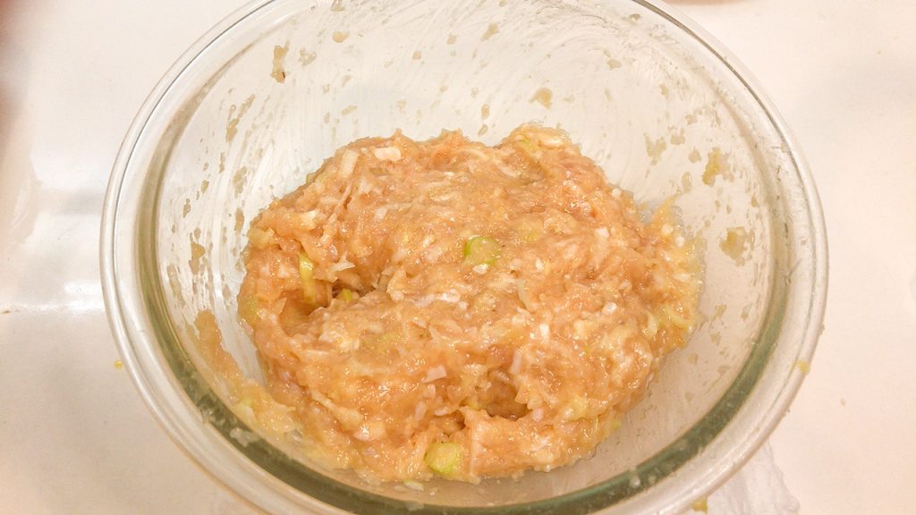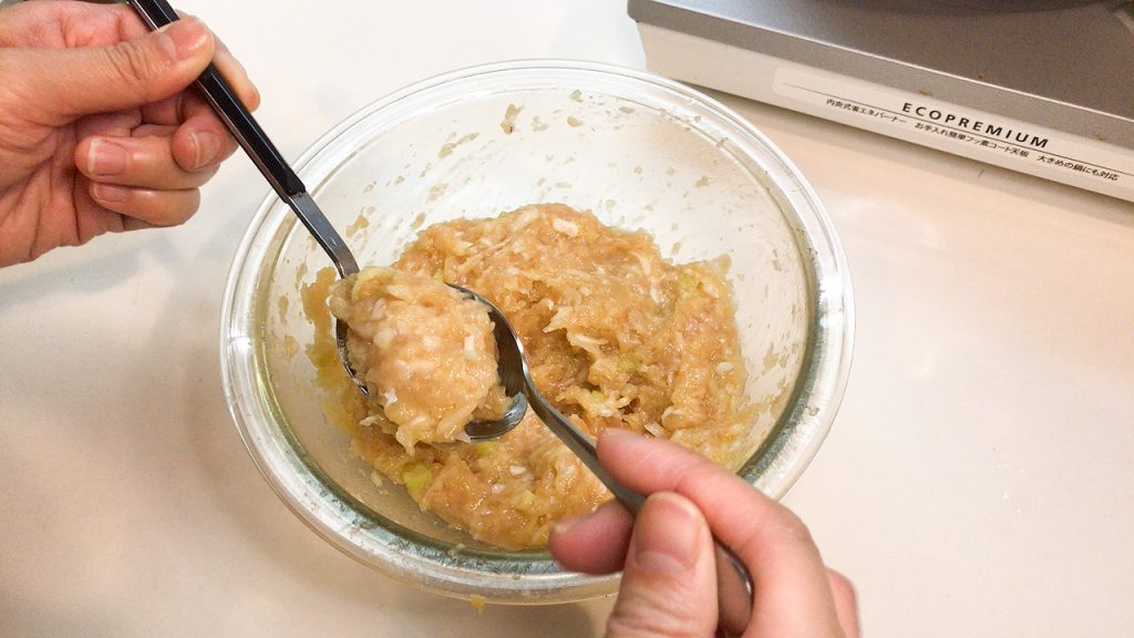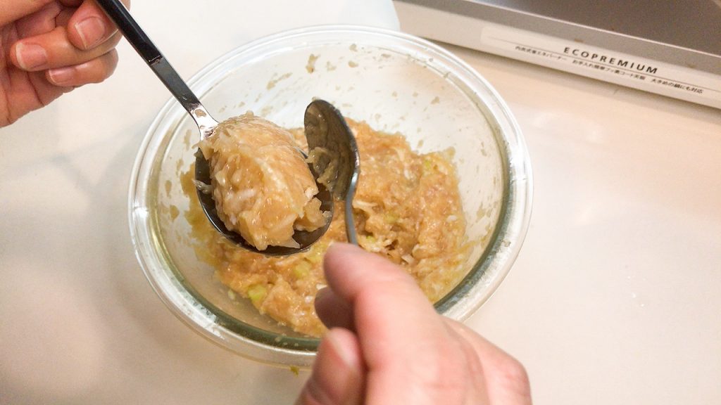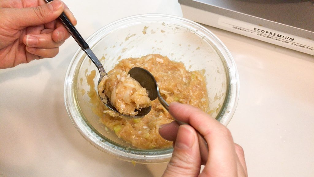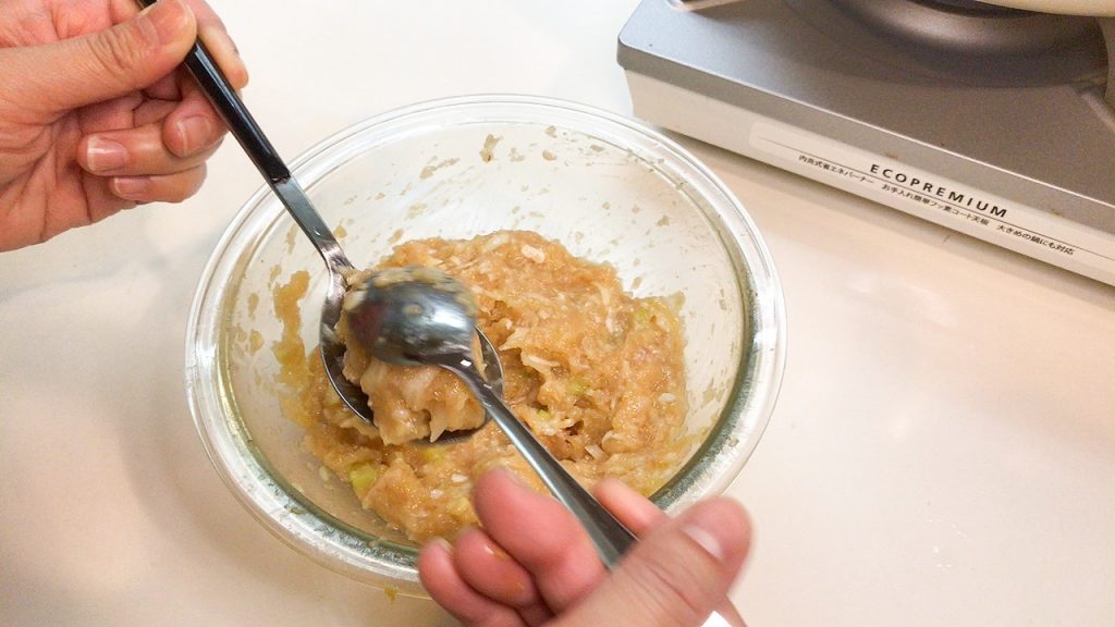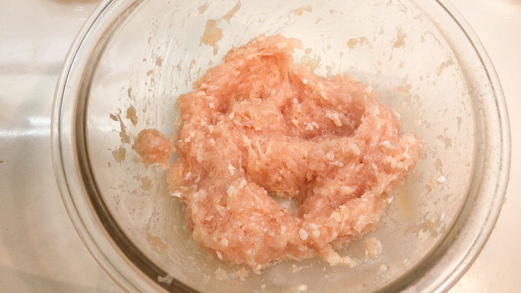 粘りを出すことでつみれがふっくらするのと、お肉と具材をつなぐ役割をしてくれます。