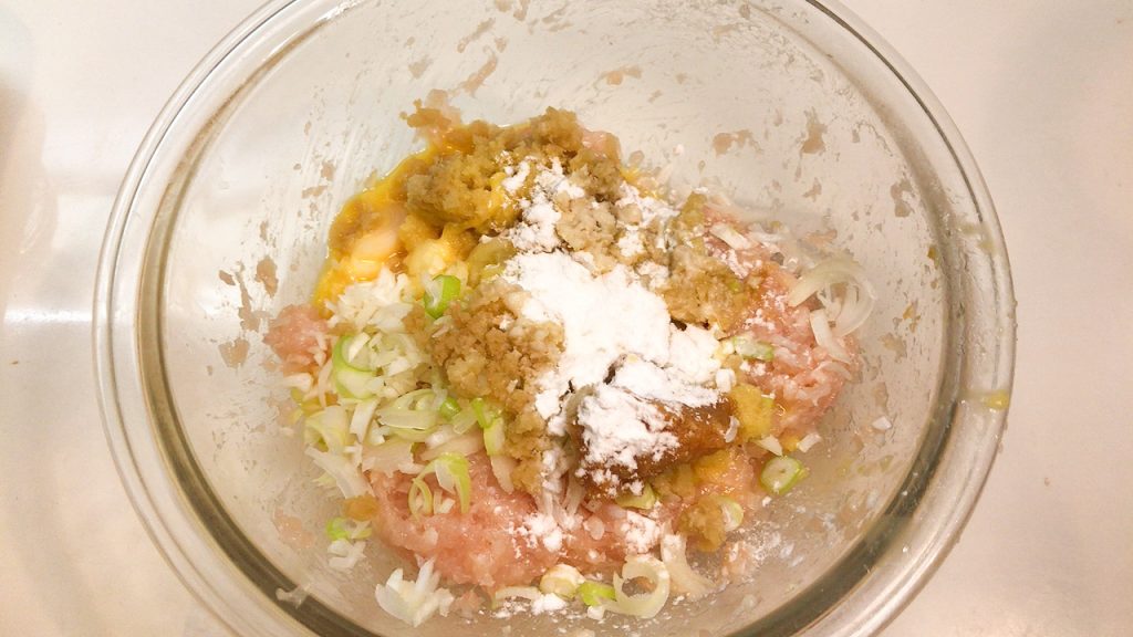 みじん切りのねぎとおろしたしょうが、溶き卵、味噌、片栗粉を加えてさらによく混ぜ合わせます。