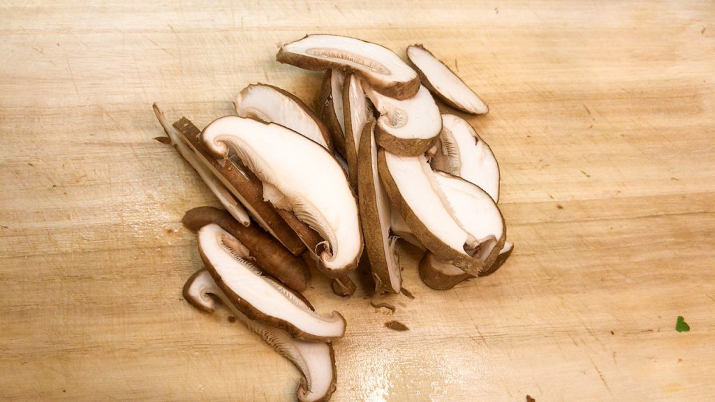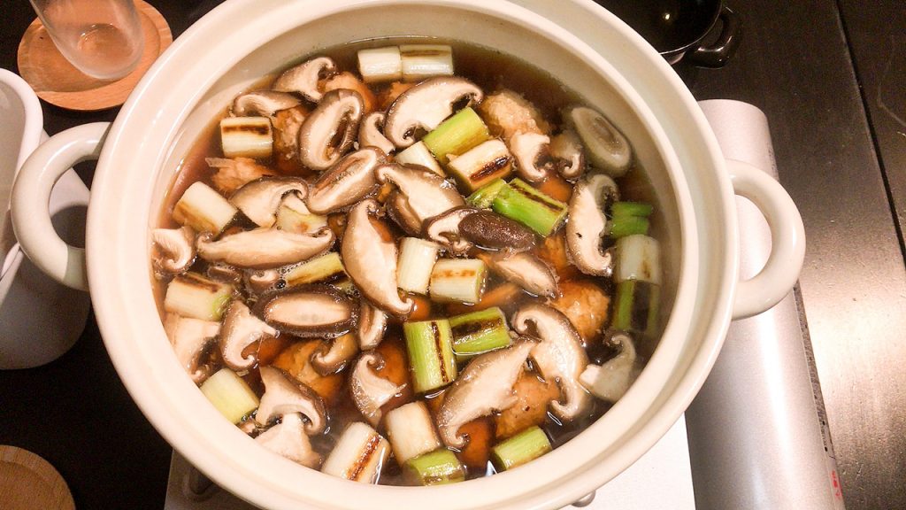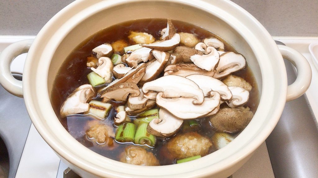 ねぎを加えて2分ほど煮ます。椎茸も同じタイミングで加えました。