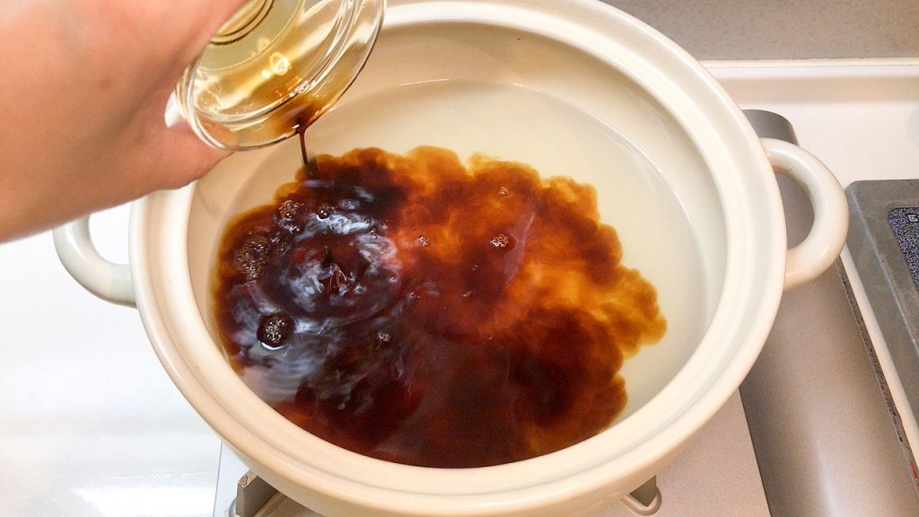 鍋に出汁と醤油、酒を加えて中火で煮立たせます。