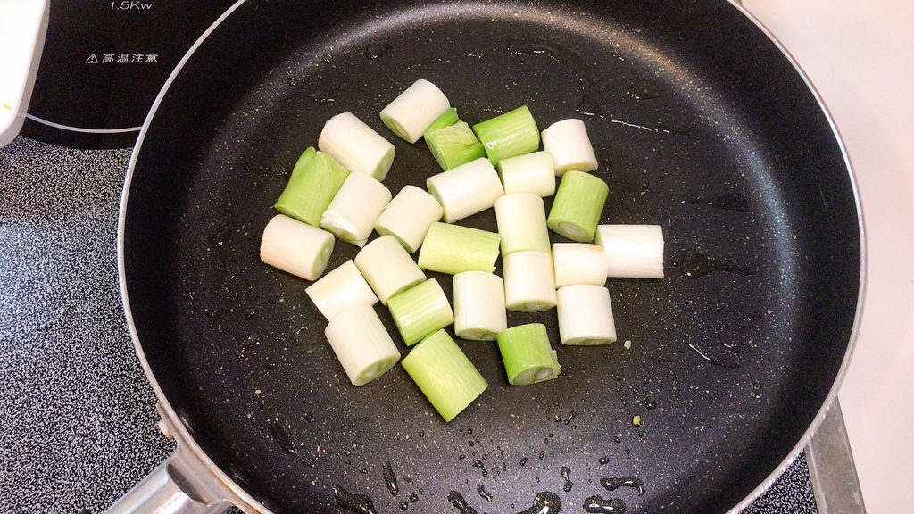 フライパンにサラダ油を薄くひいて中火で温め、ぶつ切りのねぎを入れます。